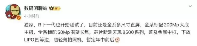 而提到Reno系列产品,以往也出现过相关的爆料信息。来自同一位博主的爆料显示,Reno系列的下一代已经开始测试了,当时还是全系多尺寸直屏,全系标配200Mp大底主摄,全系标配50Mp潜望长焦,芯片测试天玑8500系列,普及金属中框,下放LIPO四等边,超轻薄拍照机,暂定年中前后发布。