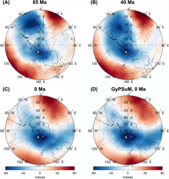 模型显示,一开始,在始新世初(约 6,500 万年前),全球重力低点位于南大西洋(30°S-45°S),且相对较弱;随后到 5,000 万~3,000 万年前,重力低点的位置快速迁移至罗斯海湾,同时幅度显著增强。
