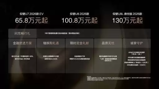 在比亚迪举办的一场重磅技术发布会上,仰望家族的三款2026年旗舰车型正式亮相并同步上市,分别为仰望U7、仰望U8以及仰望U8L鼎世版。此次推出的三款车型,售价区间全面覆盖高端市场:仰望U7起售价为65.8万元,仰望U8起售价为100.8万元,而仰望U8L鼎世版的起售价则达到130万元。这一价格矩阵的背后,彰显出比亚迪在高端新能源汽车领域坚定而清晰的战略布局。