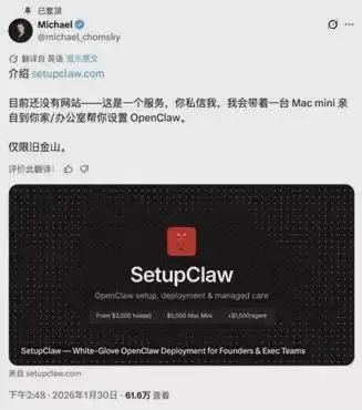 一家名为SetupClaw的代装平台已给出明码标价:托管安装3000美元,含Mac mini硬件的远程配置5000美元,现场配置更是高达6000美元。创始人Michael信心满满地表示,靠这门手艺有望年入百万美元。