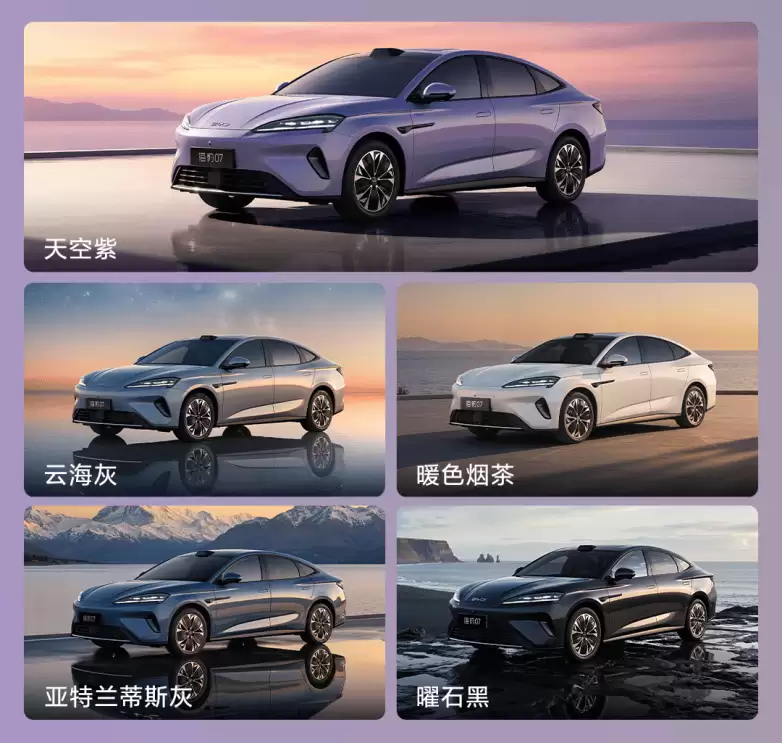外观设计延续海洋美学理念,推出“天空紫”、“云海灰”、“暖色烟茶”、“曜石黑”、“亚特兰蒂斯灰”五种车身配色。车身尺寸为4995×1910×1495毫米,轴距2900毫米,定位中型纯电轿车。车机系统搭载DiLink 150智能座舱高阶版,采用全新UI交互界面,集成全场景智能语音、手机互联、车载K歌及萌宠动态主题等功能。