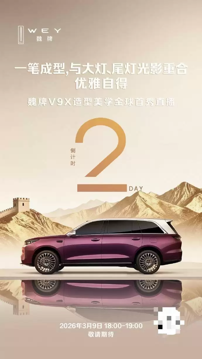 长城汽车近日宣布,旗下魏牌全新车型 V9X 的造型美学全球首秀直播活动,将于 3 月 9 日 18:00 至 19:00 正式开启。这款由长城汽车董事长魏建军亲自代言的 SUV,不仅是长城“归元”平台的首款作品,更以东方经典建筑美学为设计灵感。新车还推出了紫金双拼色车身选项,引发了市场的广泛关注。