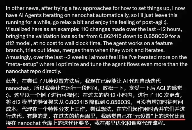 但真正的重头戏来了——Karpathy开始让AI Agent自动迭代nanoc h a t的训练代码。