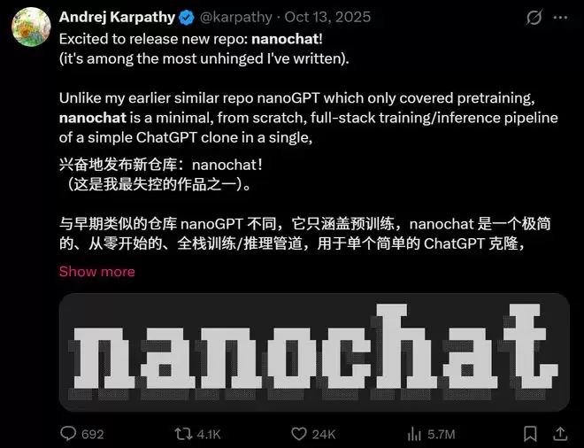 nanoc h a t是Karpathy在2025年10月开源的一个项目,口号相当炸裂——「100美元能训练的最好的ChatGPT」。
