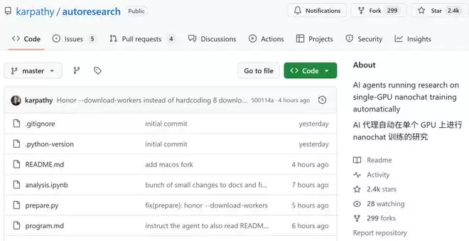 更炸裂的是,就在几天后,Karpathy把这套「AI自己搞科研」的方法论打包成了一个仅630行代码的开源项目——autoresearch,扔到了GitHub上。