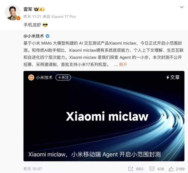 3月6日,小米正式启动移动端系统级智能体Xiaomi miclaw的小范围封闭测试。雷军在转发公告时只写了三个字:"手机龙虾"。这是小米对OpenClaw热潮的正面回应,也是手机厂商"养虾"浪潮中率先亮相的那一只。意味着这场AI Agent革命的战场,正式从极客的电脑延伸到了普通用户的手机。