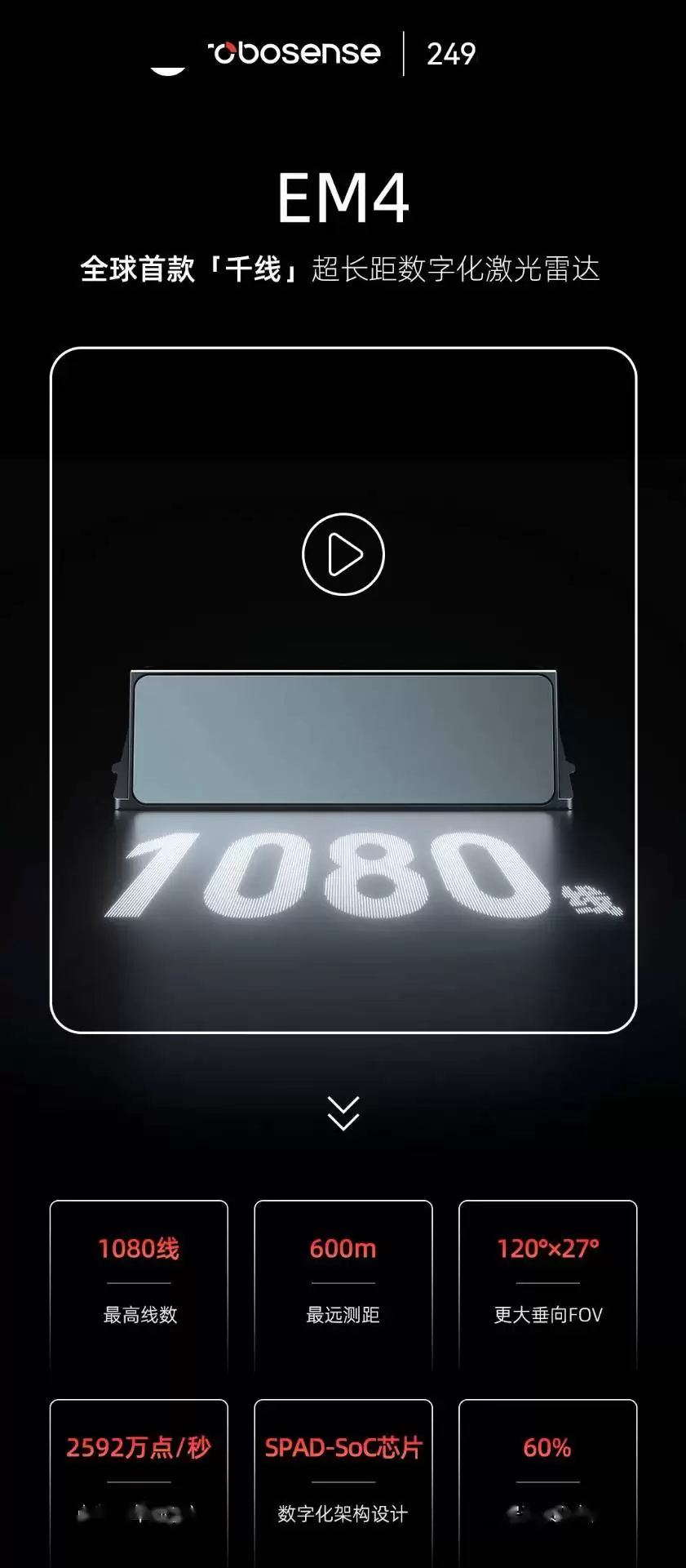 回顾2025年初,速腾聚创推出的EM4激光雷达曾引发广泛关注。作为全球首款1080线激光雷达,EM4具备最远600米的测距能力,垂直视场角达到120°×27°,点频高达每秒2592万点。这些参数使EM4能够清晰探测600米内的白色车辆、300米内的交通锥桶以及180米内的轮胎,从而显著提升车辆在紧急情况下的避让或制动能力。