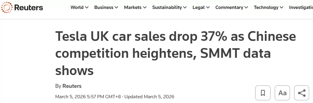 另据路透社特别报道,特斯拉和比亚迪在英国市场的走势引人关注。SMMT在周四公布的数据显示,特斯拉二月份的在英销量同比下滑了37%。报道认为,这主要是由于以比亚迪为代表的中国竞争对手所推出的电动汽车需求激增,给特斯拉带来了持续的压力。