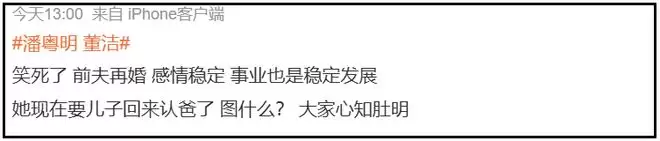 董洁相关热搜之下,网友的大实话一句比一句不好听,有人劝潘粤明赶紧再要一个小孩,有人感慨潘粤明再婚之后,董洁态度变化太明显了。
