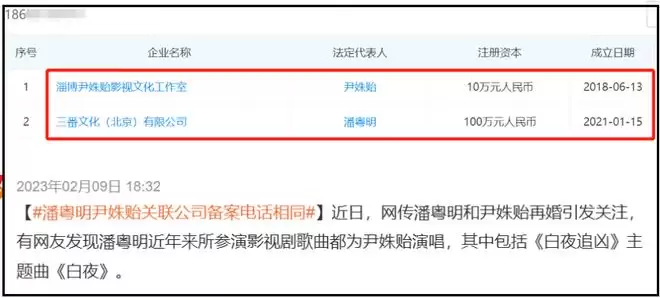 还有网友晒出了尹姝贻的朋友圈,表示尹姝贻还在帮潘粤明宣传电影,双方并没有分手,两个人公司备案电话都是一样的。