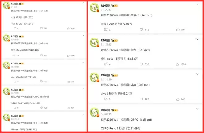 其中截至2026 W8,荣耀500系列的销量约172.05万;华为nova 15系列约183.52万;vivo S50系列约143.24万,以及OPPO Reno 15系列约231.69万。