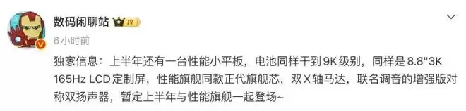 除此之外,博主@数码闲聊站 此前的一份爆料中显示,上半年还有一台性能小平板,电池同样干到9K级别,同样是8.8"3K 165Hz LCD定制屏,性能旗舰同款正代旗舰芯,双X轴马达,联名调音的增强版对称双扬声器,暂定上半年与性能旗舰一起登场。