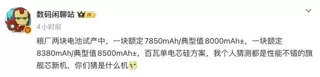 同一位博主的另一份爆料中提到过,小米旗下一款额定8380mAh/典型值8500mAh±电池已经在试产,预计是REDMI K90至尊版的电池方案。