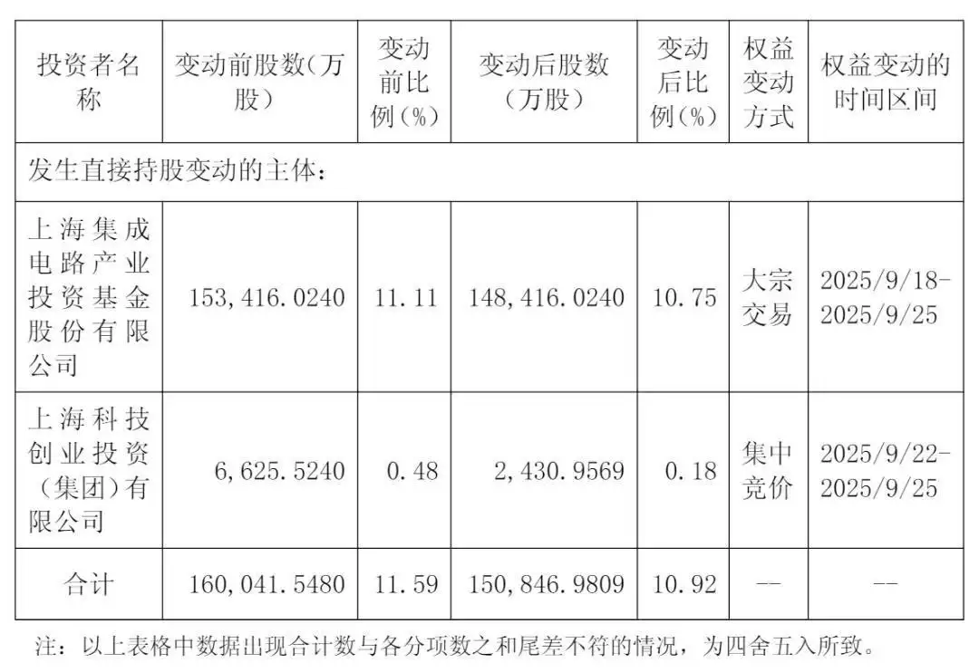 截至2025年9月25日,集成电路产业基金及科创投累计减持公司股份91,945,671股,减持股份比例约占公司总股本的0.67%,其持股比例已由11.59%下降至10.92%。