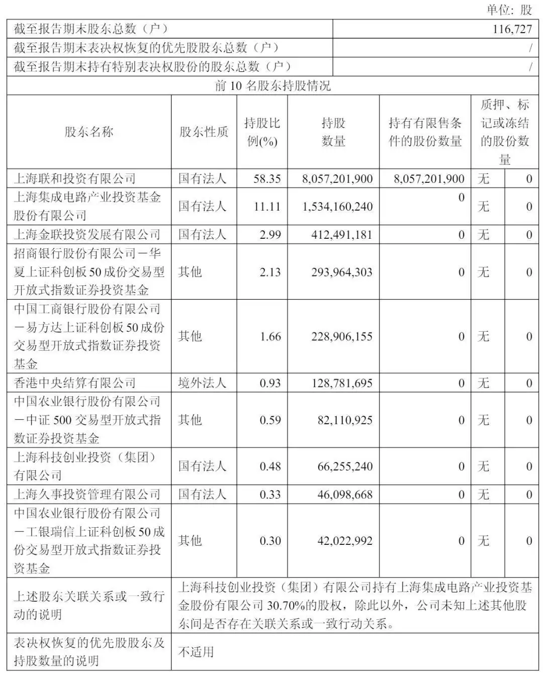 截至2025年6月30日,上海联和的持股比例为58.35%,集成电路产业基金持股11.11%,上海金联持股2.99%。
