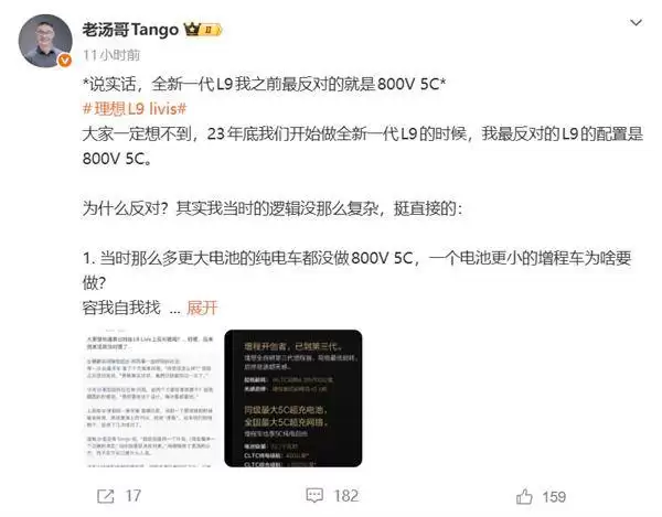 理想汽车产品线负责人汤靖曾对增程车型搭载800V+5C超充技术持明确反对态度。这一立场源于2024年底全新一代L9研发阶段的决策争议,其核心质疑集中在两点:一是增程车型电池容量普遍小于纯电车型,超充技术的必要性存疑;二是5C电池带来的成本增加与重量提升,会压缩其他配置的优化空间。