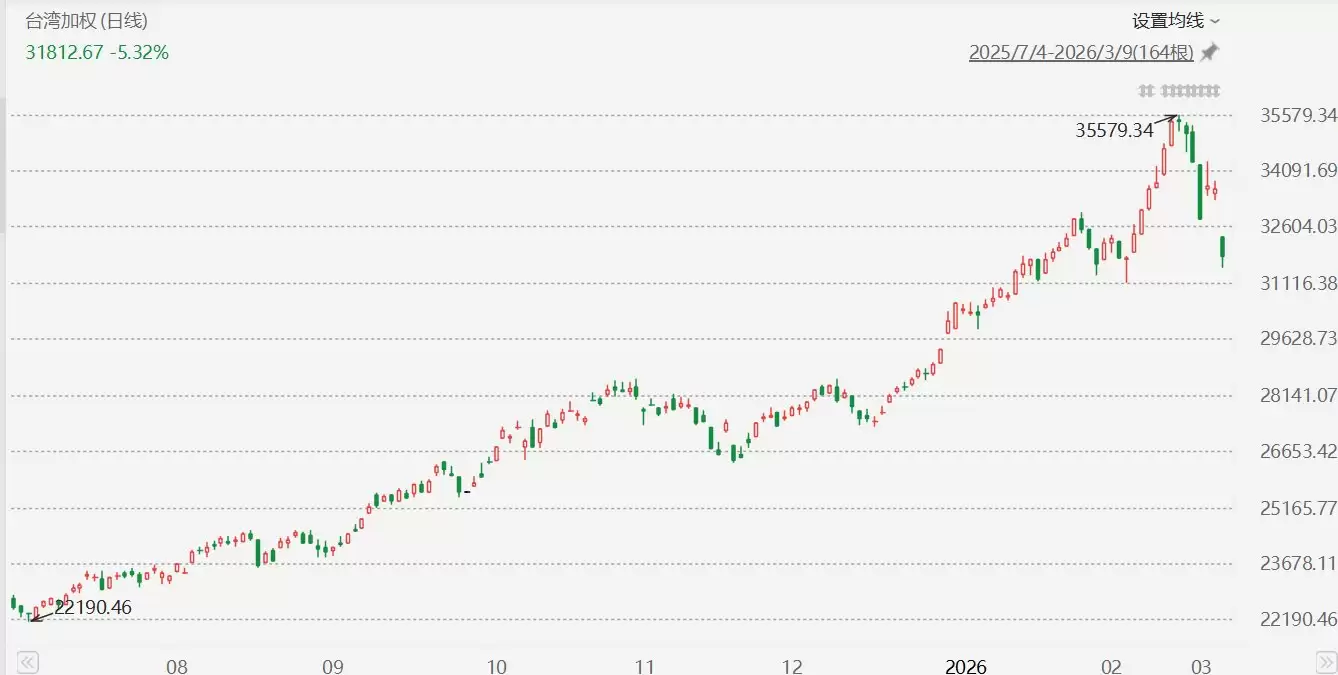 格隆汇3月9日|台股低开,台湾加权指数盘初一度跌超6%,报31529.36点。