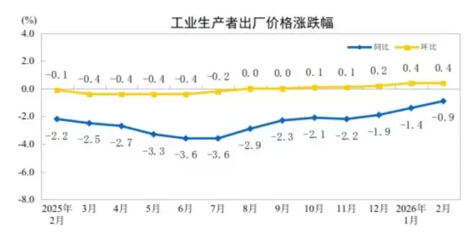 中国2月PPI同比下降0.9%,环比上涨0.4%