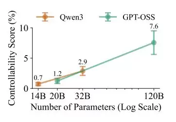 以Qwen3系列为例,从14B扩容到32B再到120B,CoT可控性勉强从0.7%爬升到了2.9%。