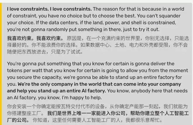 为了进一步解释这种逻辑,黄仁勋强调自己“热爱限制”。他解释道,在资源受限的环境下,客户面对极其有限的数据中心空间和电力供应,绝不会随意购买设备乱试,而是必须精准选择能稳定提供最高“每瓦 Token 产出率”的硬件。(鞭牛士)