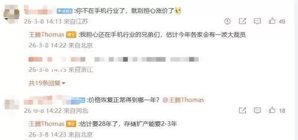 3月8日消息,小米前高管、今日宜休科技公司创始人王腾发文称,“内存二季度还要继续涨价,今年消费电子行业太难了。”王腾的这一言论迅速引发网友热议,在评论区,有网友调侃道:“你不在手机行业了,就别担心涨价了。”对此,王腾回应:“我担心还在手机行业的兄弟们,估计今年各家会有一波大裁员”。针对大家最关心的内存价格走势,王腾进一步表示,内存价格要恢复到正常水平,估计要等到2028年,而存储产能的扩充也需要2-3年时间。