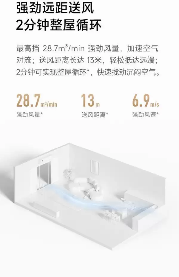 在气流性能方面,这款循环扇表现强劲。其最高档风量可达28.7立方米每分钟,送风距离远达13米,风速达到6.9米每秒。对于一个20平方米、层高2.8米的房间,仅需2分钟即可实现全屋空气循环。它搭载了3D自动摇头扫风设计,支持上下100度、左右120度的大广角摇头。用户还能通过米家App以10度为单位,精准调控送风角度,确保凉感覆盖更全面。内置的4种自然风感模式,能够模拟户外舒适气流。当它与空调搭配使用时,能让室内在60分钟内冷热均匀度提升57%,并助力空调节省约19%的电耗,共同打造更舒适宜人的室内温度环境。