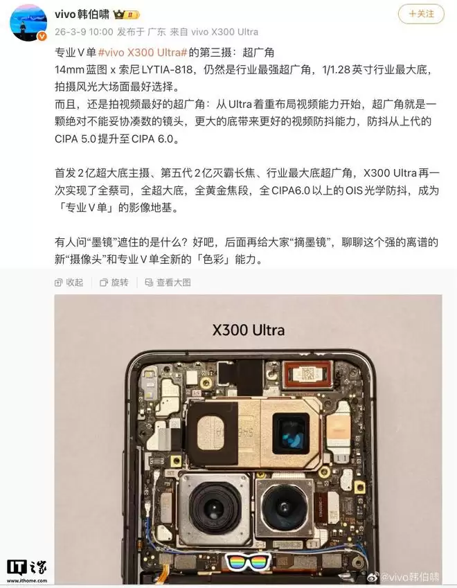 一个值得关注的细节是,在韩伯啸分享的X300 Ultra实拍图片中,有一小块区域被“墨镜”效果遮掩。部分网友在评论区猜测,这可能暗示了多光谱传感器的加入。