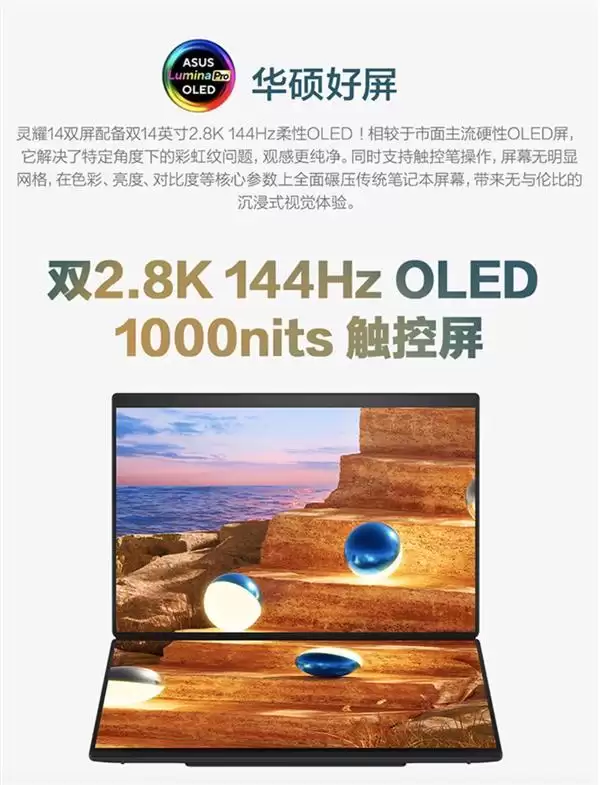 作为核心设计亮点,灵耀14 双屏 2026上下两块规格一致的14英寸的2.8k 144Hz OLED柔性触控屏,触控无网格,观感清晰,从根本上解决了传统双屏本主副屏体验割裂的问题。拥有100% P3广色域与1000nits HDR峰值亮度,在视频调色时能够精准显示色彩,并且加入了康宁DXC 2.0抗反射涂层,在强光下也能清晰的看见屏幕上的内容,创作生产力拉满。硬件级低蓝光认证更能呵护用眼健康,长时间工作也不易疲惫。