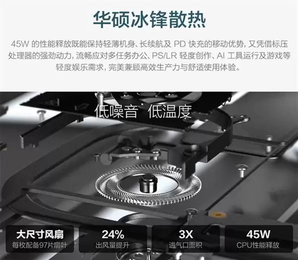 为了让强悍性能持续释放,灵耀14 双屏 2026配备了华硕冰锋散热系统,双风扇双热管散热架构搭配97片大扇叶风扇,进风口面积较上代扩增3倍,出风量提升24%,助力实现至高45W性能释放。