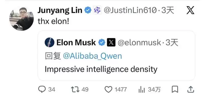 就在这条推文发布的前一天晚上,Qwen团队刚刚推出了Qwen 3.5轻量化模型。该模型发布后,埃隆·马斯克称赞其具有“impressiveintelligence density”,林俊旸随后回复并与之友好互动。