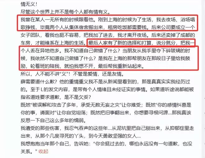 段曦最后还不忘喊话薛之谦:“不用道歉”,并称他的义气是自己真实经历过的,所以薛之谦不需要道歉。