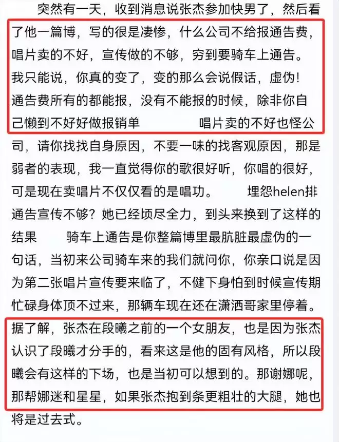 而这位爆料人说得更直白,他直言当时张杰参加快男之后就卖惨,说自己骑自行车上通告,公司不给报销通告费。可实际上,公司这些都会报销,只要自己肯按公司报销流程走即可,坦言张杰的这些变化让他觉得很虚伪。