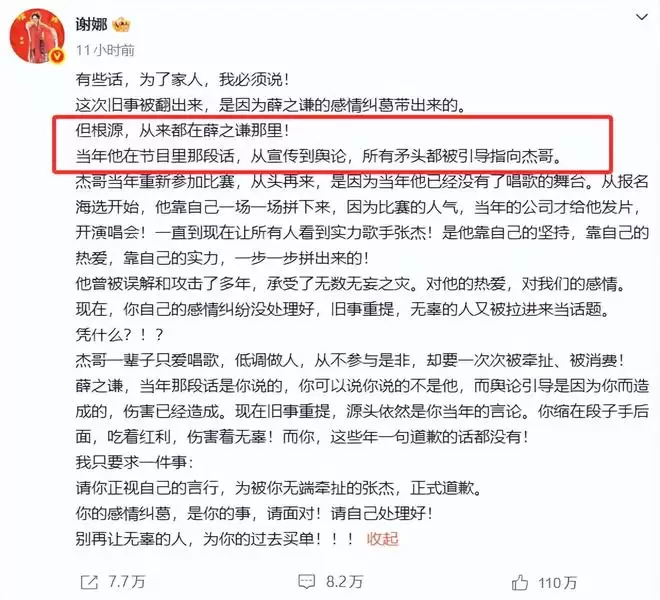 而现在谢娜发文让薛之谦道歉,也提及了薛之谦当时的这句话,她将现在的这些讽刺,都归咎于当时薛之谦的暗讽。