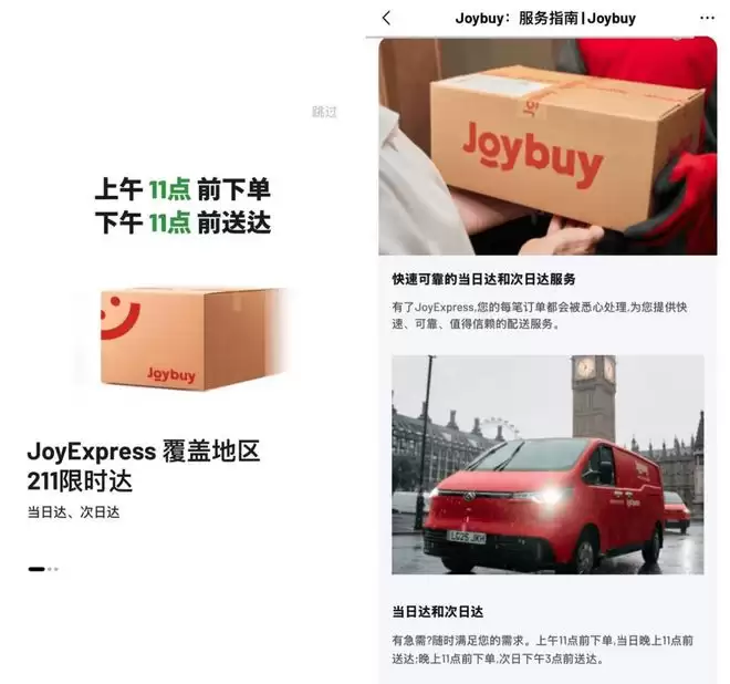 壹览商业下载Joybuy App发现,平台已在部分地区上线"JoyExpress"配送服务,主打当日达与次日达。页面显示,在指定覆盖区域内,上午11点前下单可实现当晚送达。