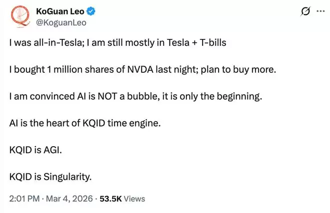 2026年3月4日,华裔富豪廖凯原(Leo KoGuan)在社交平台X上宣布,已买入100万股英伟达股票,耗资约1.8亿美元,并计划继续增持。