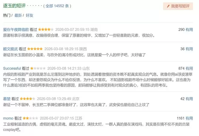《逐玉》的制作水准无需多言,只不过在同行衬托下不算太难看。但也有不甘心的网友在豆瓣上口诛笔伐,比如有高赞评论捶胸顿足“内娱的影视剧产业到底是怎么沦落到这种地步的,到处透漏着傲慢的资本瞧不起真实观众的气息。就像你用ai浮皮潦草写了一个东西,却还要怨观众为什么不给你反馈,为什么不喜欢。 不知道影视剧市场什么时候能够好起来。”