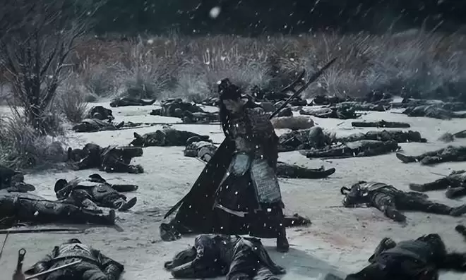 还有战场是谢征一身染血铠甲,撑着长枪独自站在遍地尸体中,灰白的画面看起来更加凄凉悲壮。