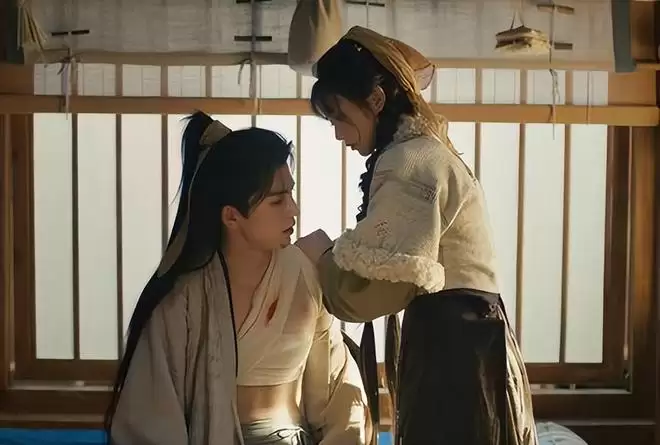 重伤苏醒,长发凌乱,白衣衬得脸色更加苍白、憔悴,装扮稍显狼狈,但却是朴素越能凸显硬朗的五官,眼神中带着警惕,首次出场就立住了人设。