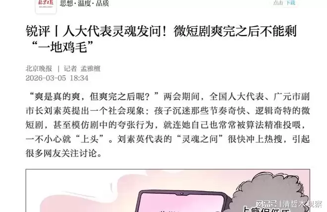 在今年两会期间,全国人大代表、广元市副市长刘素英提出一个社会现象:孩子沉迷那些节奏奇快、逻辑奇特的微短剧,甚至模仿剧中的夸张行为,就连她自己也常常被算法精准投喂,一不小心就“上头”。刘素英代表的“灵魂之问”很快冲上热搜,引起很多网友关注讨论.