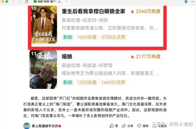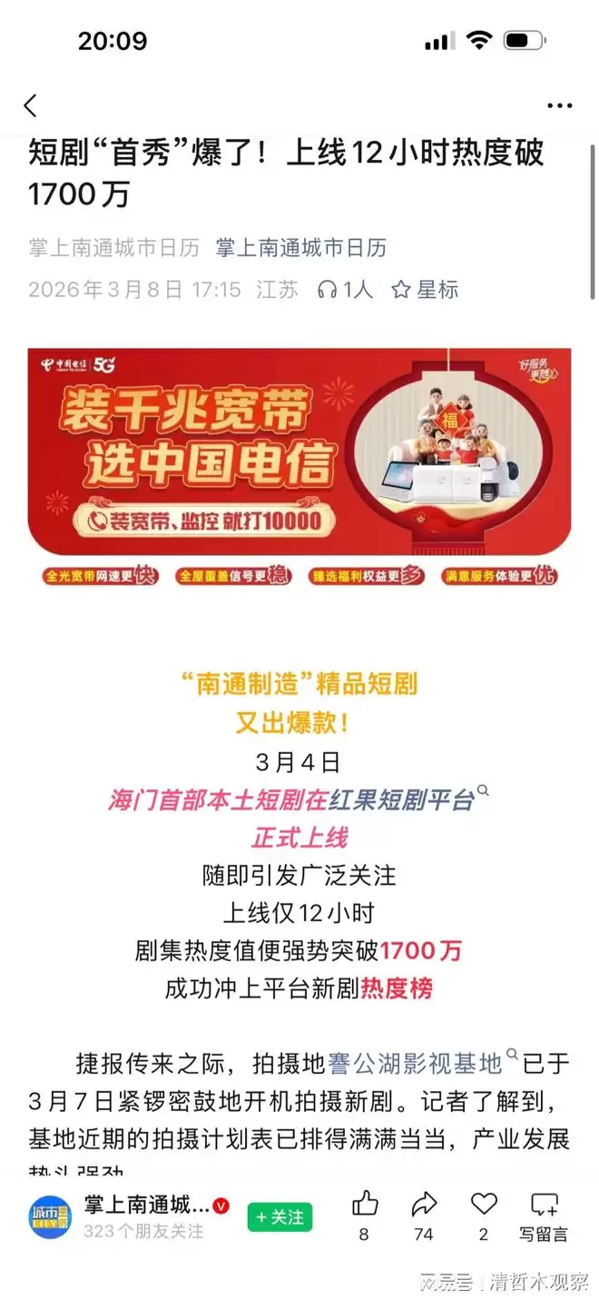 昨天,有南通地方媒体报道;“南通制造”精品短剧又出爆款!海门首部本土短剧在红果短剧平台正式上线,上线仅12小时,剧集热度值便强势突破1700万,成功冲上平台新剧热度榜。