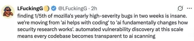 网友则认为,Claude 的这一战绩无疑是在表明,当下大家正在经历从「AI 辅助编程」到「AI 从根本上改变安全研究运作方式」的转变。而这种规模的自动化漏洞能力,也就意味着,每一个代码库在 AI 扫描面前都将变得「透明」。