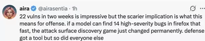 同样,也有网友表示担忧,短时间内能够找到安全漏洞固然让人印象深刻,但更令人担忧的是,「这对进攻端意味着什么?」如果一个模型能在如此短的时间内发现 Firefox 中的 14 个高危漏洞,那么攻击面发现的博弈规则已经发生了永久性的改变:防御方获得了一个利器,但其他人(攻击者)也同样拥有了它。」