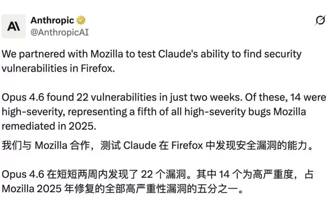 近日,Anthropic 公布了一组惊人的数字,在与 Mozilla 公司进行合作,测试旗下模型 Claude Opus 4.6 发现漏洞能力的过程中,两周内,就找出 Mozilla 公司「火狐」(Firefox)浏览器中 22 个不同的漏洞,其中 14 个是「高危漏洞」级别,而这几乎是 Mozilla 2025 年修复的全部「高危漏洞」的五分之一。
