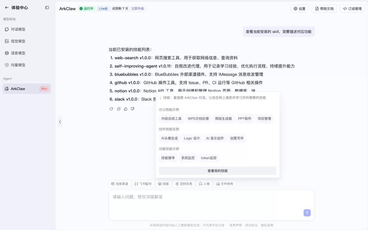 ArkClaw深度协同豆包-Seed-2.0系列模型,在复杂任务处理上表现优异。它不仅支持Kimi 2.5、MiniMax 2.5、GLM等主流大模型,还内置了海量Skills,覆盖代码生成、文档处理、数据分析等多种常用场景。