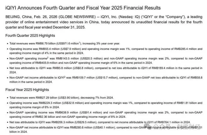 2025年的财报,是爱奇艺长视频基本盘全面萎缩的"溃败证明",营收、利润、会员、广告四大核心维度全线失守,所谓的"IP-centric战略",终究没能掩盖长视频增长引擎彻底熄火的现实。