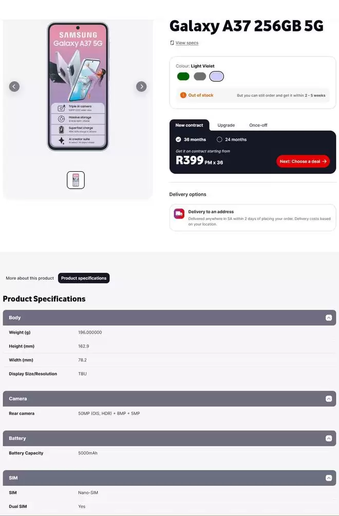 规格方面,参数表显示Galaxy A57的尺寸为161.5*76.8*6.9mm,相比7.4mm厚的上代机型A56更加纤薄,重量也从前代的198g降至179g,手感更为轻盈。相比之下,A37的尺寸为162.9*78.2*7.4mm,重196g。