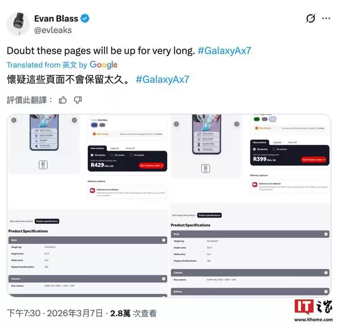 IT之家3月9日消息,消息人士Evan Blass近日在X平台发文,曝光了疑似来自某电商平台的三星Galaxy A57与A37手机的详细参数表。