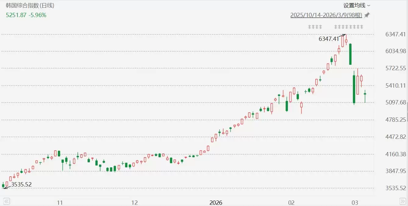 3月9日,油价飙升重创韩国股市。韩国综合指数盘中一度下挫8.75%,跌破5096.16点;收盘时跌幅为5.96%,报收于5251.87点。至此,韩国综合指数年内涨幅收窄至24.62%。