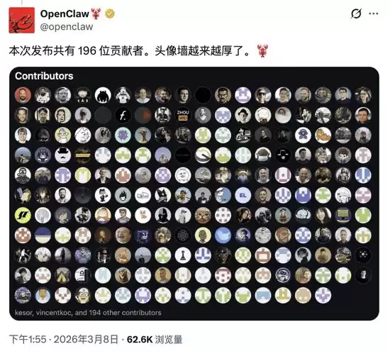 它用实战成绩告诉我们,开源工具早就不是商业大厂的“平替”了。在架构逻辑的底层创新上开源社区往往走得更远也更激进。OpenClaw最新在日志中特别致谢本次更新共有196位全球贡献者参与,其中不乏各行各业的顶尖大拿。