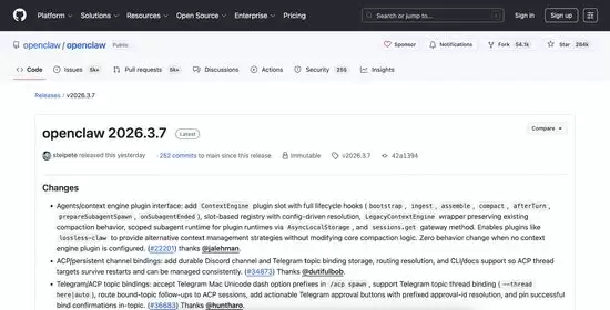 就在许多“养虾人”为此抓狂时,2026年3月7日,开源项目OpenClaw在GitHub上重磅发布了2026.3.7版本更新(链接:https://github.com/openclaw/openclaw/releases/tag/v2026.3.7)。